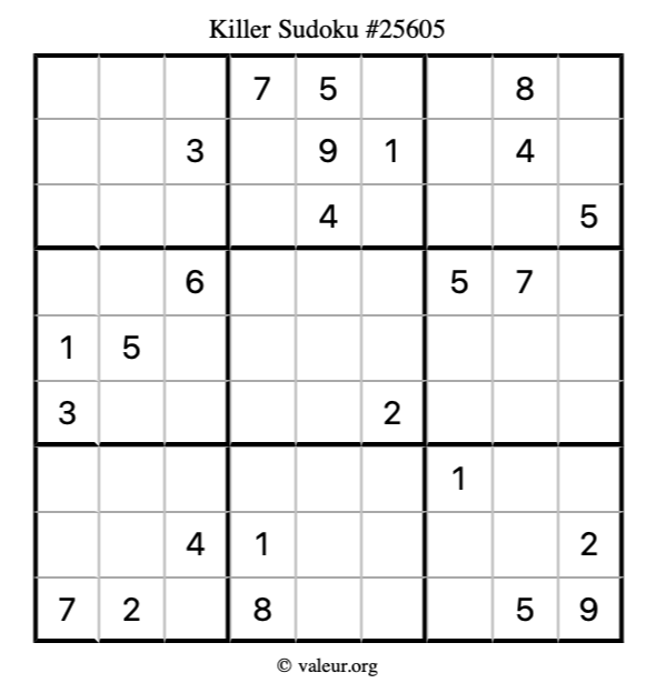 Here is our printable Killer Sudoku Puzzle #25605. You are welcome to print a copy for yourself and solve it the old-fashioned way with a pencil and an eraser!