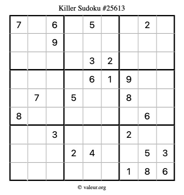 Here is our printable Killer Sudoku Puzzle #25613. You are welcome to print a copy for yourself and solve it the old-fashioned way with a pencil and an eraser!