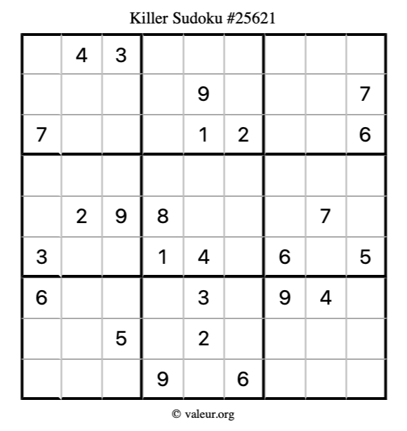 Here is our printable Killer Sudoku Puzzle #25621. You are welcome to print a copy for yourself and solve it the old-fashioned way with a pencil and an eraser!