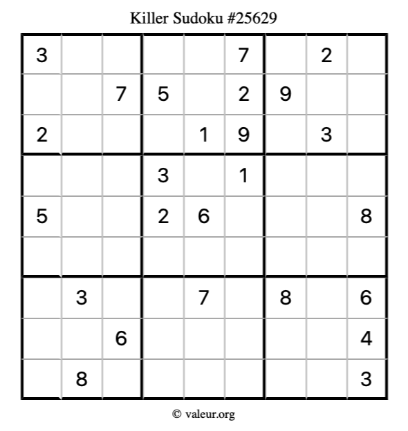 Killer Sudoku puzzle #25629 is not the only killer Sudoku puzzle in our database. We have thousands of killer Sudoku puzzles that you can print and solve. Check them out here!
