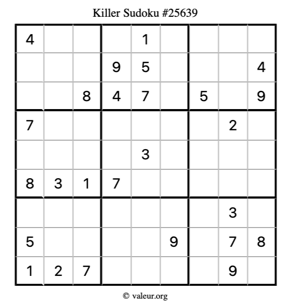 Here is our printable Killer Sudoku Puzzle #25639. You are welcome to print a copy for yourself and solve it the old-fashioned way with a pencil and an eraser!