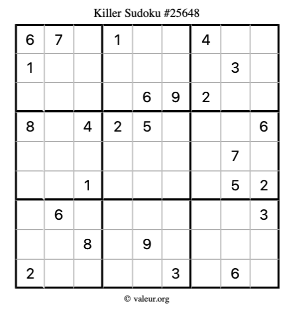Here is our printable Killer Sudoku Puzzle #25648. You are welcome to print a copy for yourself and solve it the old-fashioned way with a pencil and an eraser!