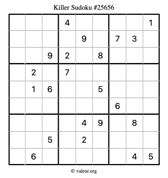 Here is our printable Killer Sudoku Puzzle #25656. You are welcome to print a copy for yourself and solve it the old-fashioned way with a pencil and an eraser!