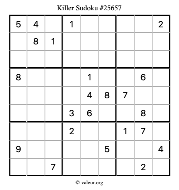 Here is our printable Killer Sudoku Puzzle #25657. You are welcome to print a copy for yourself and solve it the old-fashioned way with a pencil and an eraser!