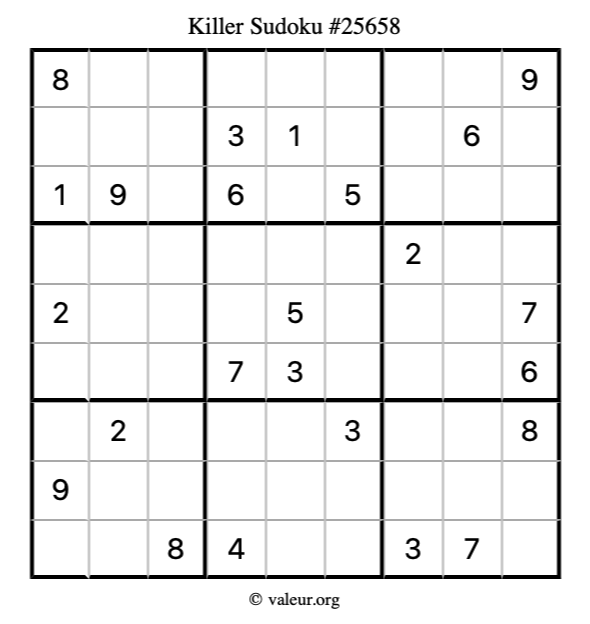 Here is our printable Killer Sudoku Puzzle #25658. You are welcome to print a copy for yourself and solve it the old-fashioned way with a pencil and an eraser!