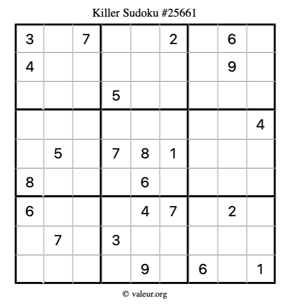 Here is our printable Killer Sudoku Puzzle #25661. You are welcome to print a copy for yourself and solve it the old-fashioned way with a pencil and an eraser!