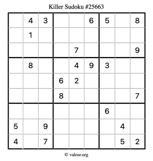 Here is our printable Killer Sudoku Puzzle #25663. You are welcome to print a copy for yourself and solve it the old-fashioned way with a pencil and an eraser!