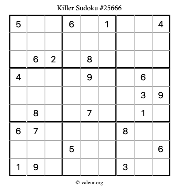 Here is our printable Killer Sudoku Puzzle #25666. You are welcome to print a copy for yourself and solve it the old-fashioned way with a pencil and an eraser!