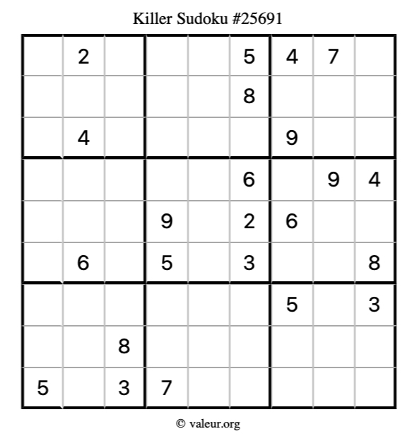 Here is our printable Killer Sudoku Puzzle #25691. You are welcome to print a copy for yourself and solve it the old-fashioned way with a pencil and an eraser!
