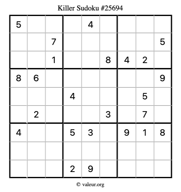 Here is our printable Killer Sudoku Puzzle #25694. You are welcome to print a copy for yourself and solve it the old-fashioned way with a pencil and an eraser!
