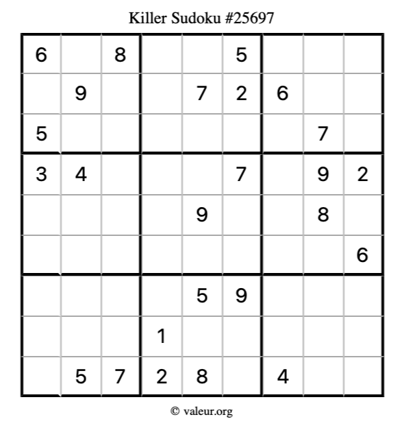 Killer Sudoku puzzle #25697 is not the only killer Sudoku puzzle in our database. We have thousands of killer Sudoku puzzles that you can print and solve. Check them out here!