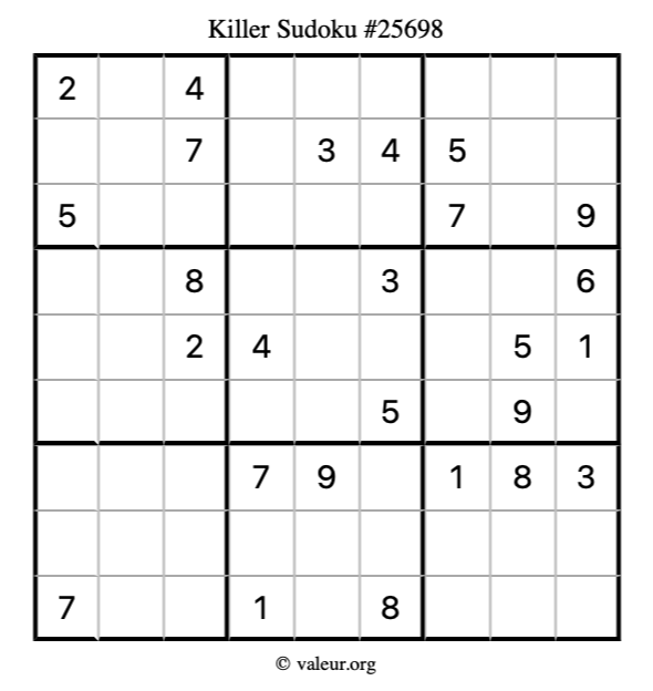 Here is our printable Killer Sudoku Puzzle #25698. You are welcome to print a copy for yourself and solve it the old-fashioned way with a pencil and an eraser!