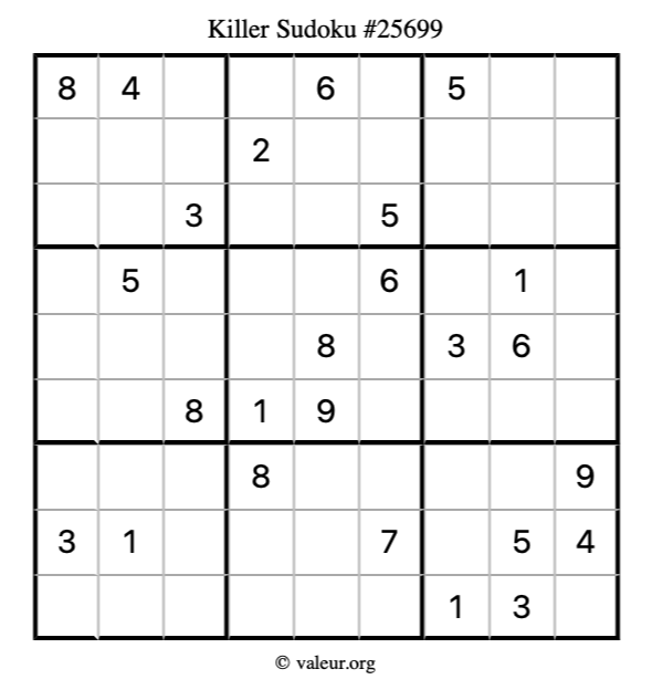 Here is our printable Killer Sudoku Puzzle #25699. You are welcome to print a copy for yourself and solve it the old-fashioned way with a pencil and an eraser!