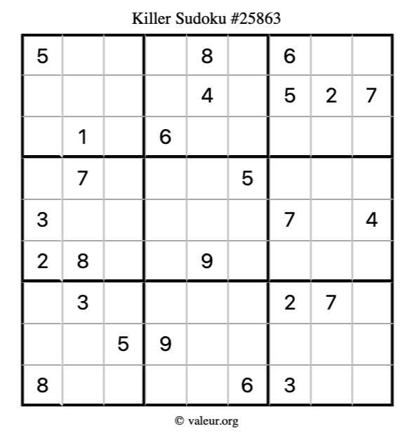 Killer Sudoku puzzle #25863 is not the only killer Sudoku puzzle in our database. We have thousands of killer Sudoku puzzles that you can print and solve. Check them out here!