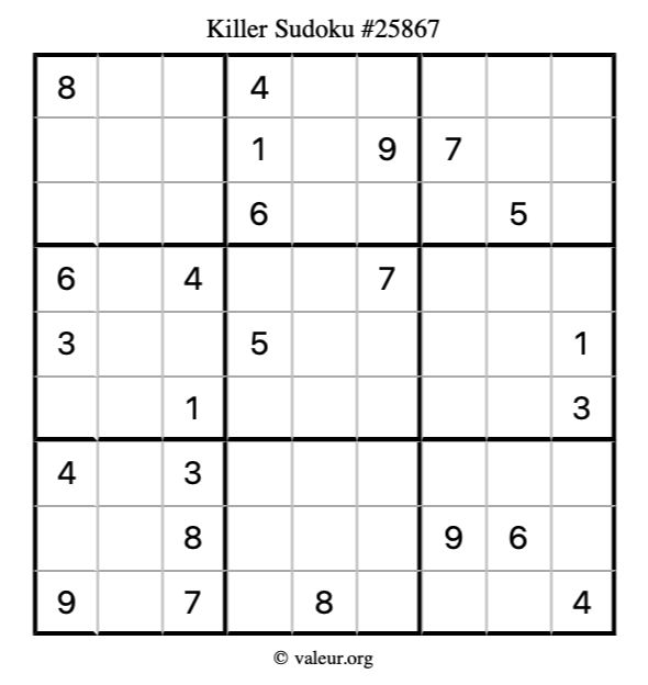 Here is our printable Killer Sudoku Puzzle #25867. You are welcome to print a copy for yourself and solve it the old-fashioned way with a pencil and an eraser!